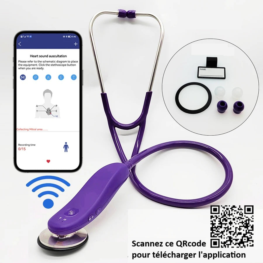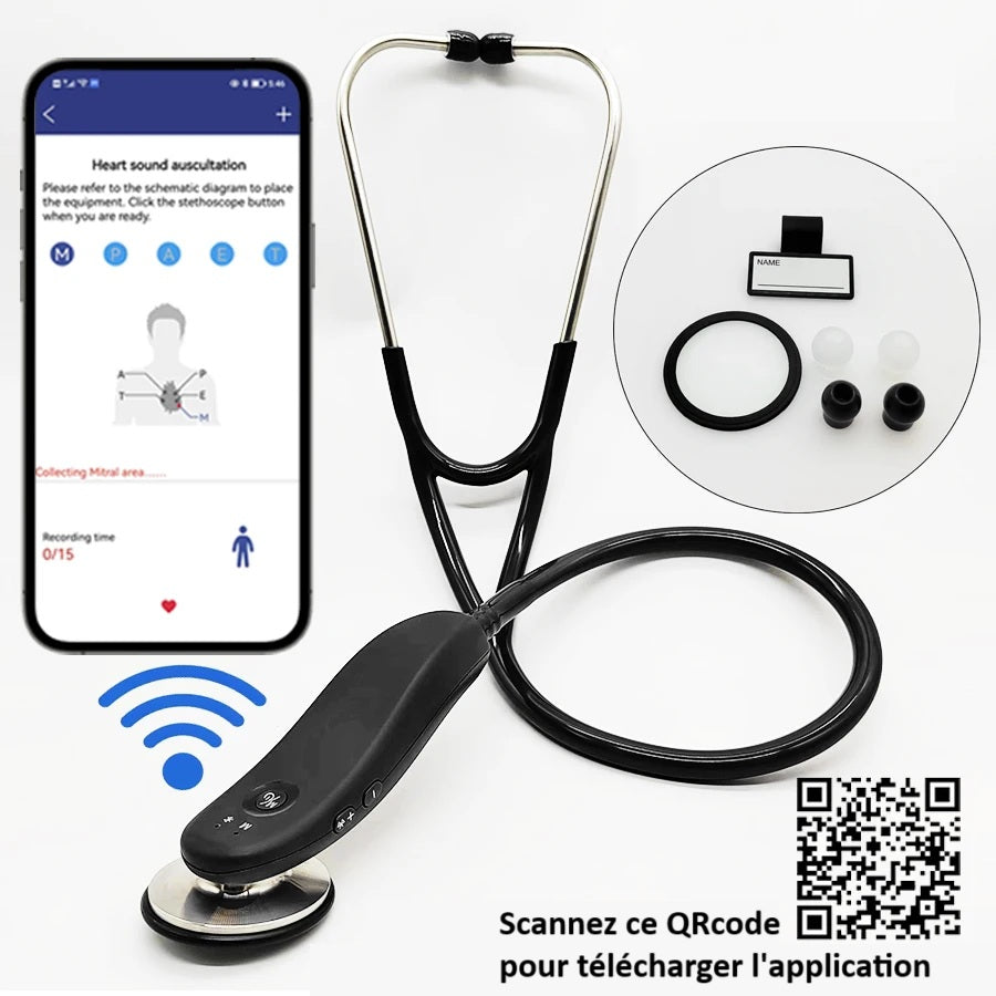 Découvrez notre stéthoscope électronique connecté Bluetooth, un outil de diagnostic médical innovant conçu pour les professionnels de santé et les étudiants en médecine. Grâce à son amplification jusqu’à 40x, son application exclusive et sa technologie avancée de réduction du bruit, il offre une écoute précise et un enregistrement sécurisé des sons cardiaques et pulmonaires.